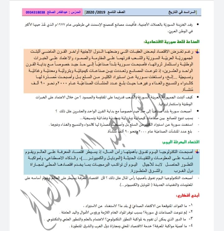 شروحات كتاب تاريخ سورية الحديثة للصف التاسع