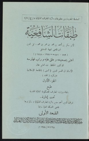 كتاب طبقات الشافعية تأليف أبو بكر بن أحمد بن محمد بن عمر الأسدي الشهبي الدمشقي تقي الدين ابن قاضي شهبة الجزء الأول تاريخ النشر 1978 م الناشر مطبعه مجلس