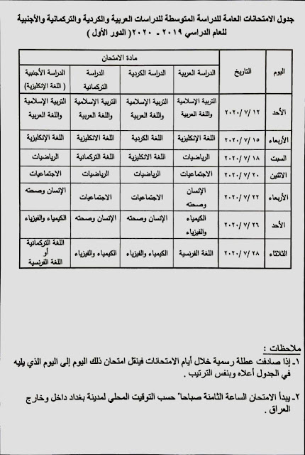 مواعيد الامتحانات الوزارية 2020 في العراق ملازمنا