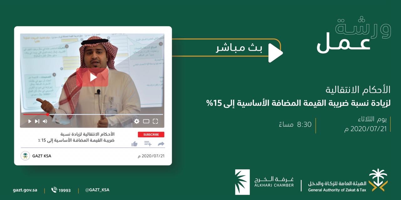 الهيئة العامة للزكاة والدخل در توییتر ندعوكم لحضور ورشة عمل الأحكام الانتقالية لزيادة نسبة ضريبة القيمة المضافة الأساسية إلى 15 عن بعد من خلال البث المباشر بالتعاون مع Kcciorg