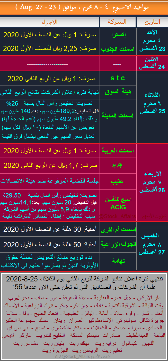 Twitter पर شؤون الأسهم مواعيدالاسبوع احقية ارباح سهم الجوف الزراعيه اسمنت ام القرى صرف توزيعات الارباح اكسترا اسمنت الجنوب العربية جرير الاتصالات تخفيض رأس مال اسمنت المدينه اسيج تهامه عذيب نهاية فترة اعلان نتائج الربع الثاني للشركات مثل دار