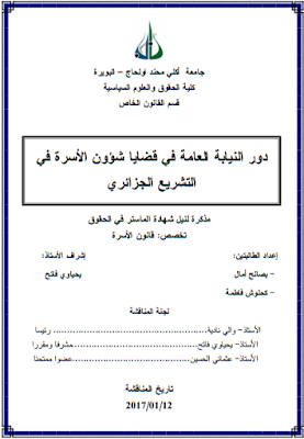 مذكرة ماستر دور النيابة العامة في قضايا شؤون الأسرة في التشريع الجزائري Pdf