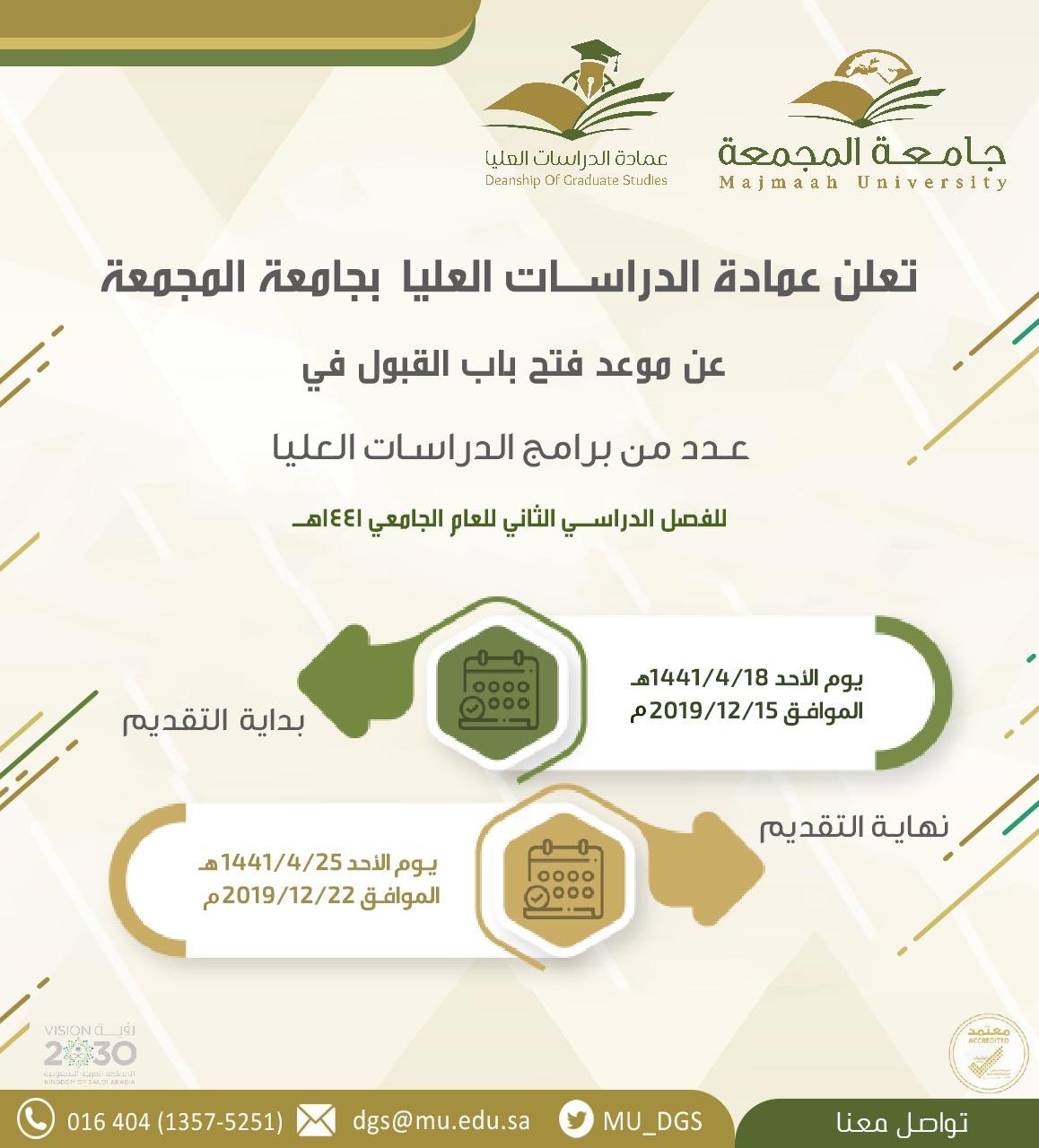 عمادة الدراسات العليا تعلن عن مواعيد التقديم على برامج الدراسات العليا للعام الجامعي 1442هـ Majmaah University