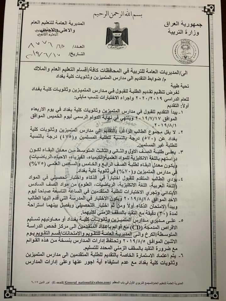 ضوابط التقديم إلى مدارس المتميزين وثانوية كلية بغداد 2020