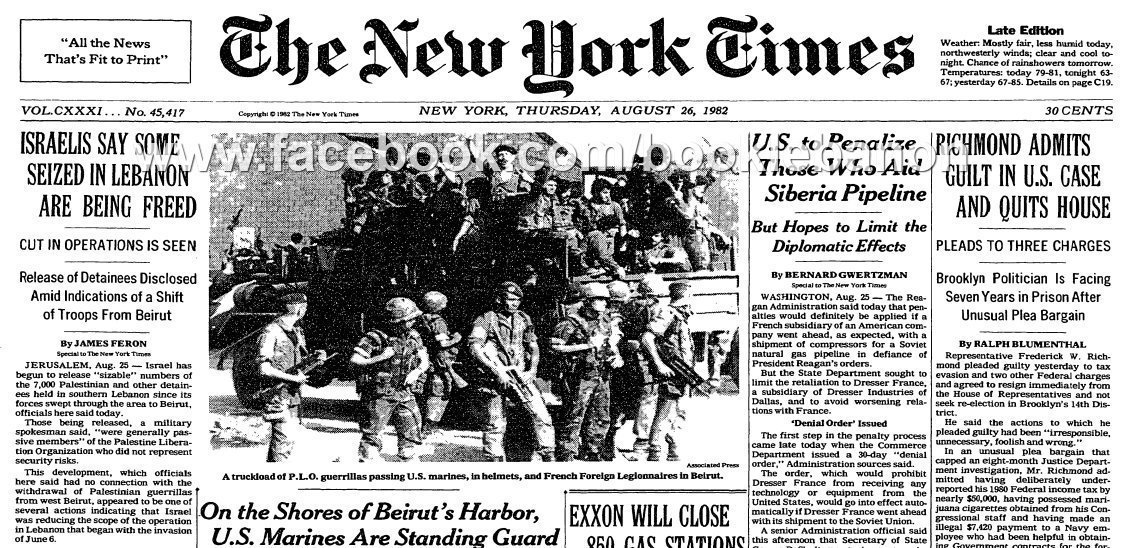 أرشيف لبنان Lebanon Archives No Twitter 15 الصفحة الرئيسية لنيويورك تايمز عدد 26 آب 1982 16 17 18 عناصر من المارينز يواكبون انسحاب المقاتلين الفلسطينيين عبر مرفأ بيروت Https T Co Hgrjurdlwm
