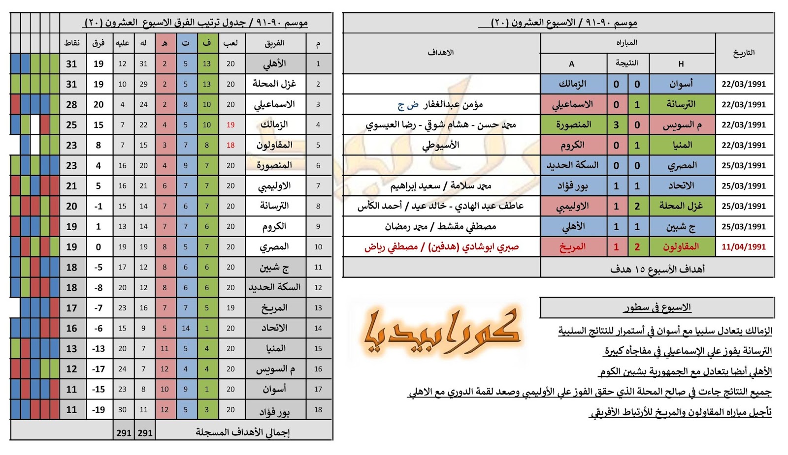 تاريخ الدوري المصري موسم 90 1991 الأسابيع 21 20 كورابيديا
