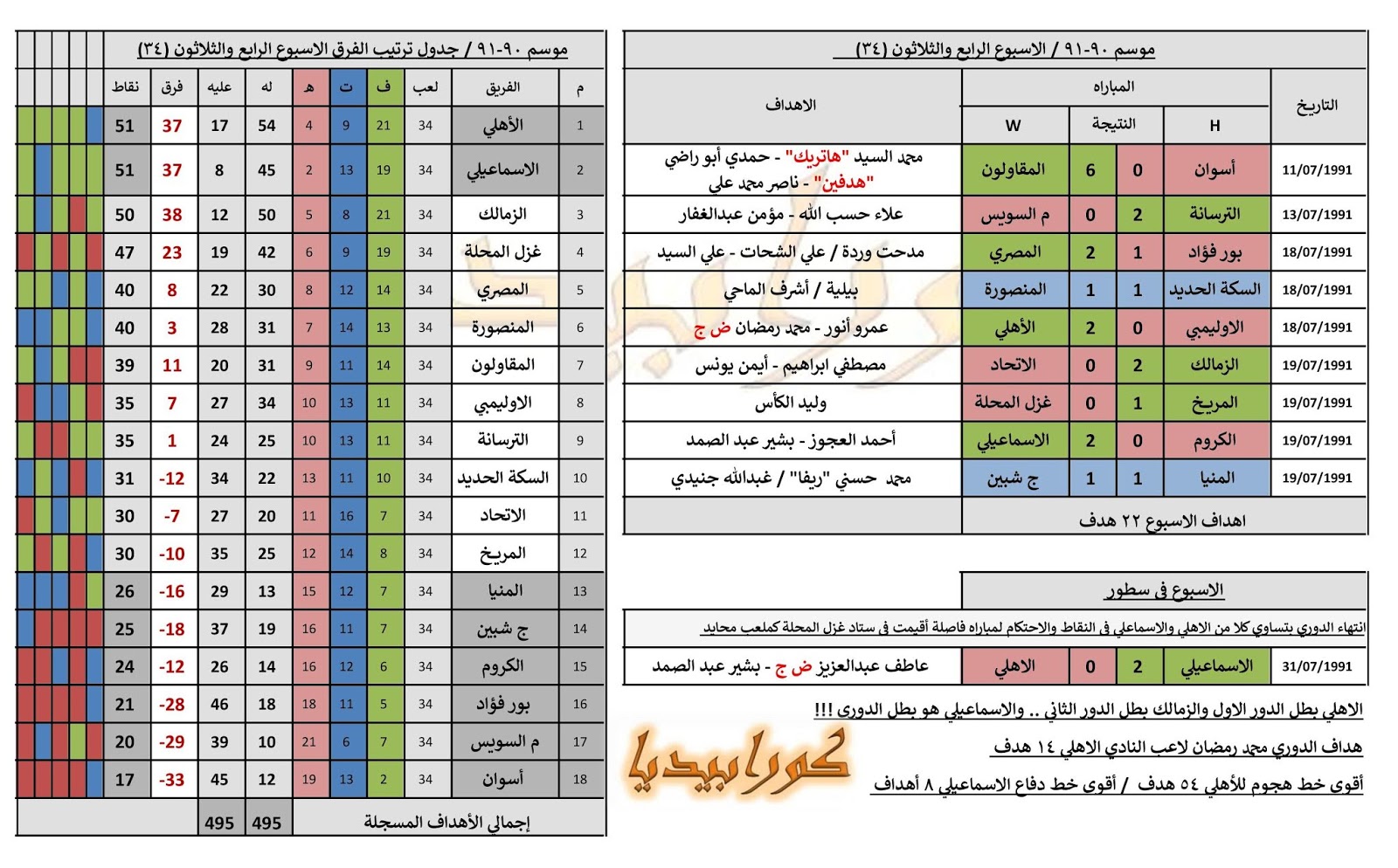 تاريخ الدوري المصري موسم 90 1991 الأسبوع 34 الأخير كورابيديا