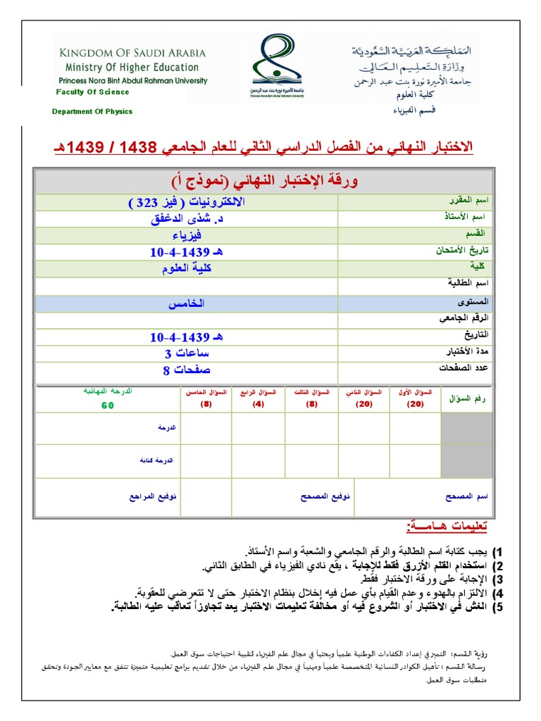 اختبار نهائي الالكترونيات الفصل الثاني1438 نموذج أ 1