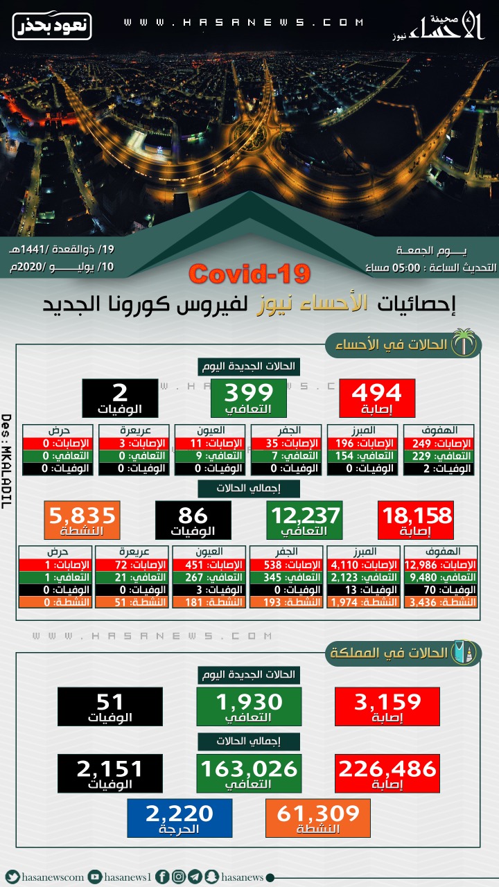 صحيفة الاحساء نيوز أدناه انفوجرافيك يوضح كامل احصائيات وتفاصيل فيروس كورونا المستجد في الأحساء و إجمالي المملكة حتى تاريخ اليوم 1441 11 19ه