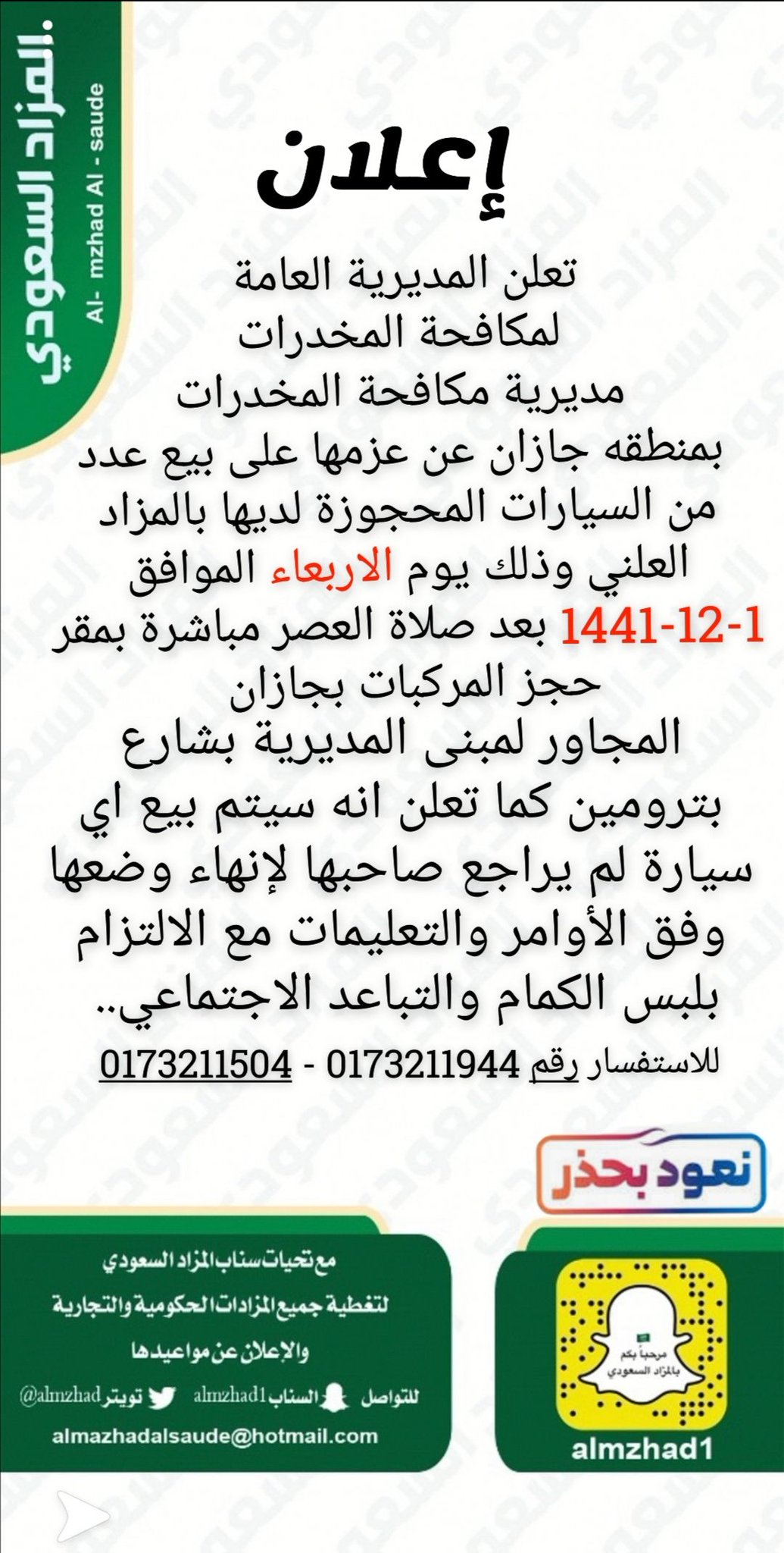 المزاد السعودي On Twitter مزاد بمنطقة جازان بتاريخ 1 12 1441 تعلن مديرية مكافحة المخدرات بمنطقه جازان عن عزمها على بيع عدد من السيارات المحجوزة لديها بالمزاد العلني وذلك يوم الاربعاء الموافق 1 12 1441 بعد