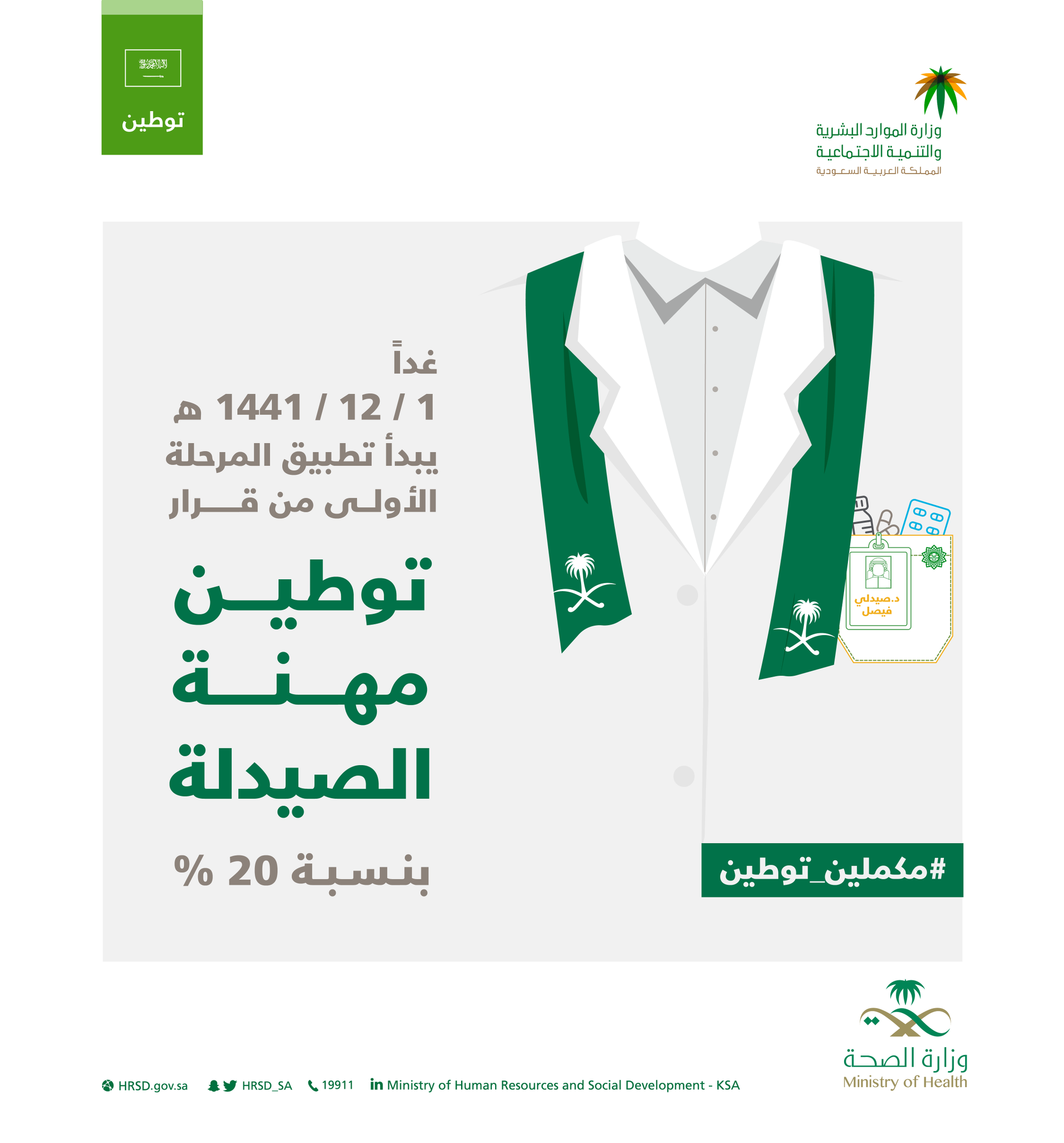 وزارة الموارد البشرية والتنمية الاجتماعية On Twitter غد ا 1 12 1441 هـ تبدأ وزارة الموارد البشرية والتنمية الاجتماعية بتطبيق المرحلة الأولى من قرار توطين مهنة الصيدلة بنسبة 20 مكملين توطين Https T Co Wskoqifut6