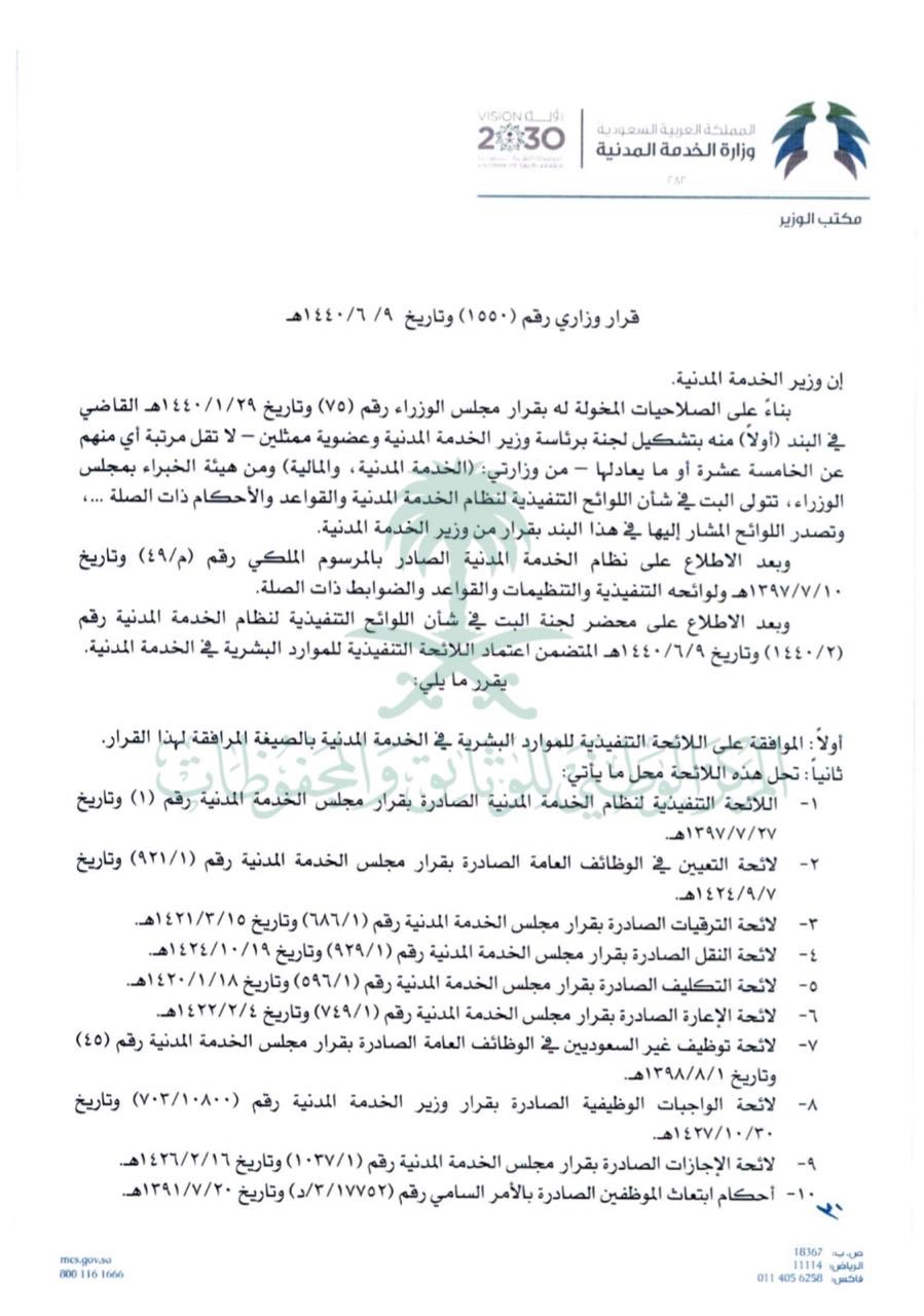 بوابة الموظفين A Twitteren القرار الوزاري رقم 1550 وتاريخ 1440 6 9هـ باعتماد اللائحة التنفيذية للموارد البشرية في الخدمة المدنية تحل هذه اللائحة محل اللوائح الواردة في هذا القرار وتلغي كل ما يتعارض مع