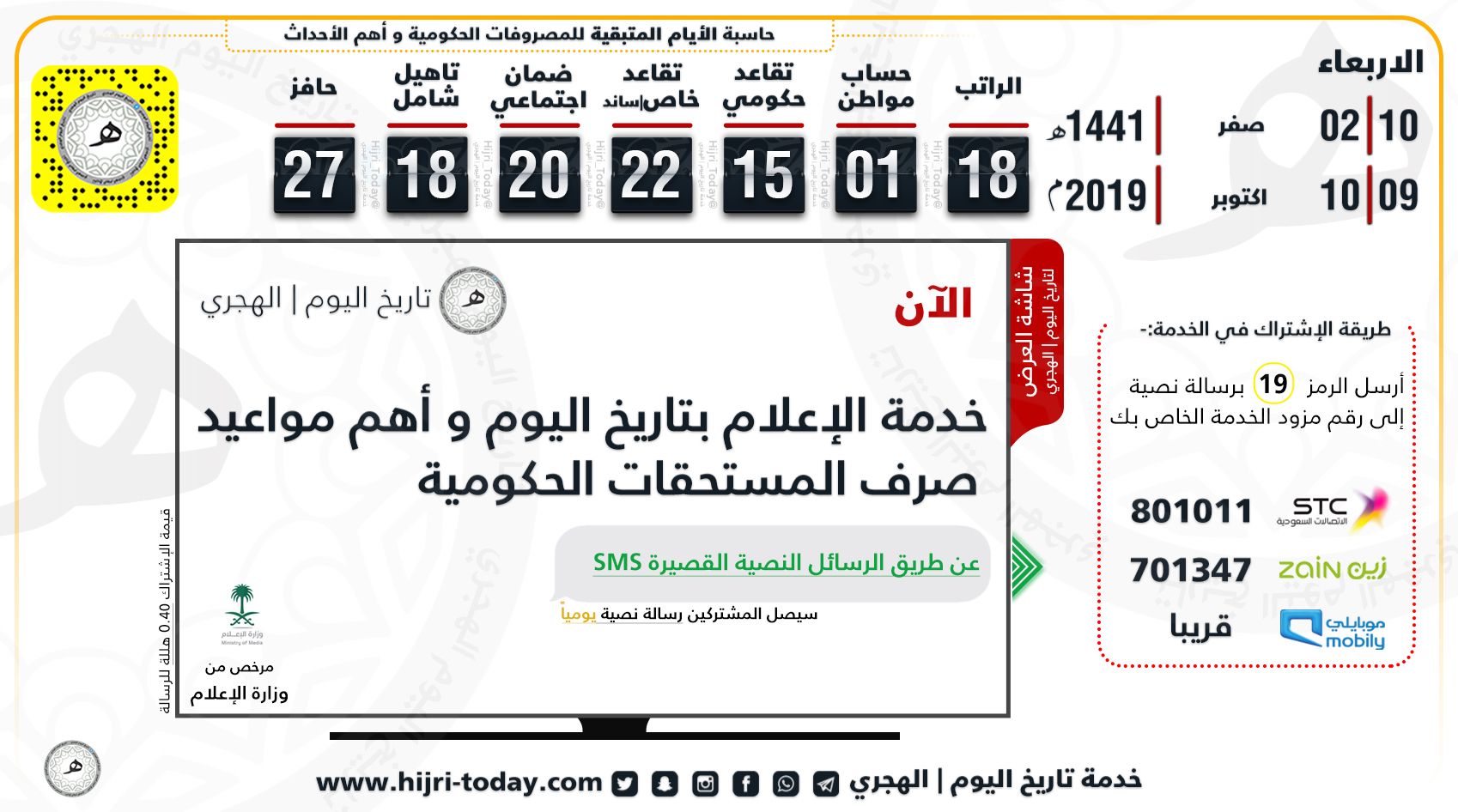 تاريخ اليوم الهجري On Twitter الاربعاء 10 صفر 2 1441هـ يوافق 9 أكتوبر 10 2019م أيام متبقيه الراتب 18 ح المواطن 1 تقاعد حكومي 15 تقاعد خاص ساند 22 الضمان 20 التأهيل 18 حافز 27 حسابنا على سنابشات Https T Co Qlfvzispgp استغفر الله